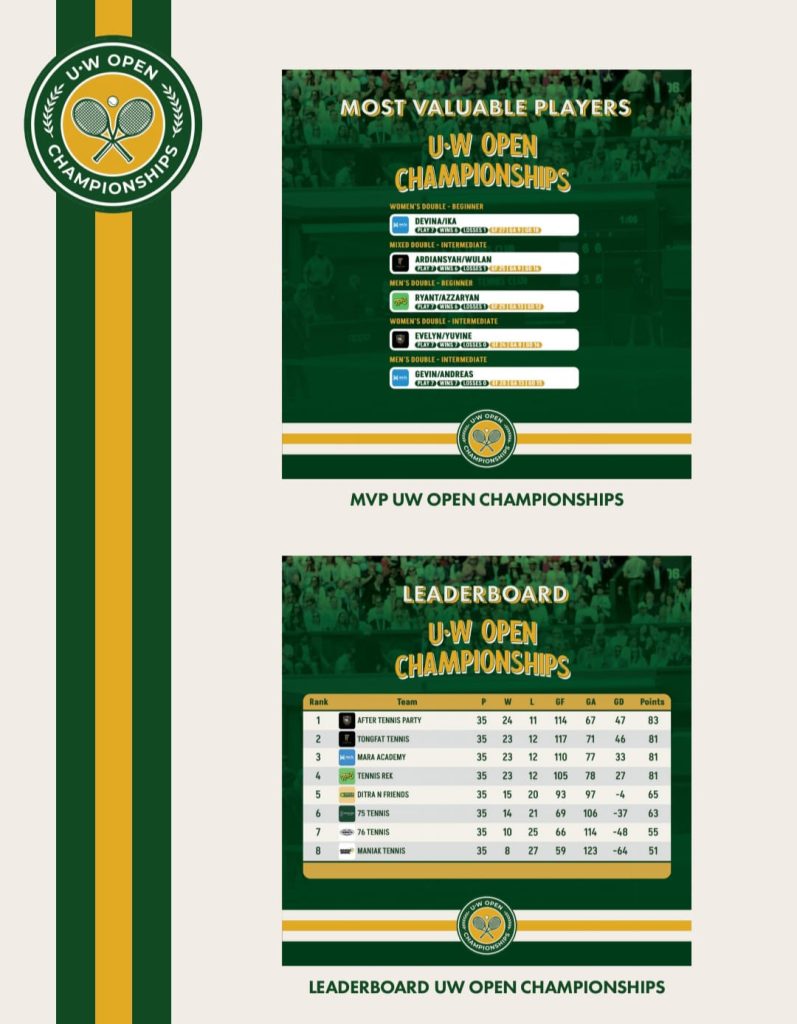 suaranurani.com | SURABAYA – Gelaran UW Open Championships yang berlangsung sejak 23 Februari 2024 hingga 25 Februari 2024 diikuti oleh 80 anggota dari delapan komunitas tenis se-Surabaya.