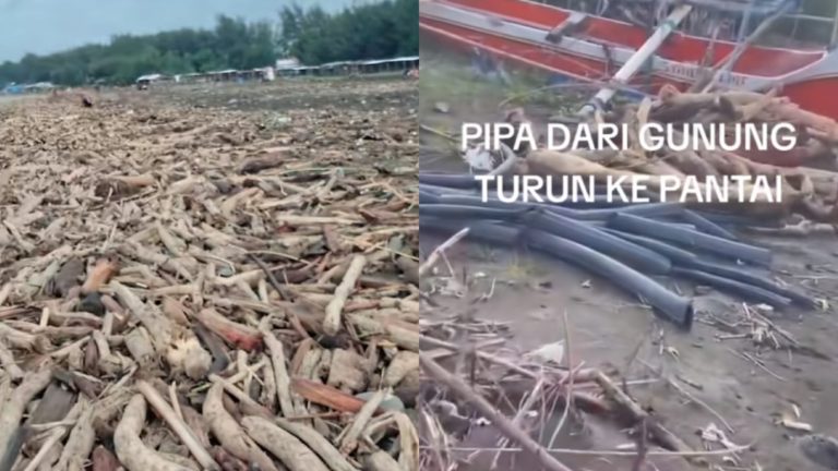 Salah satu unggahan viral warga di akun TikTok @hallopuspita, menunjukkan hamparan Pantai Larangan yang penuh dengan kayu.