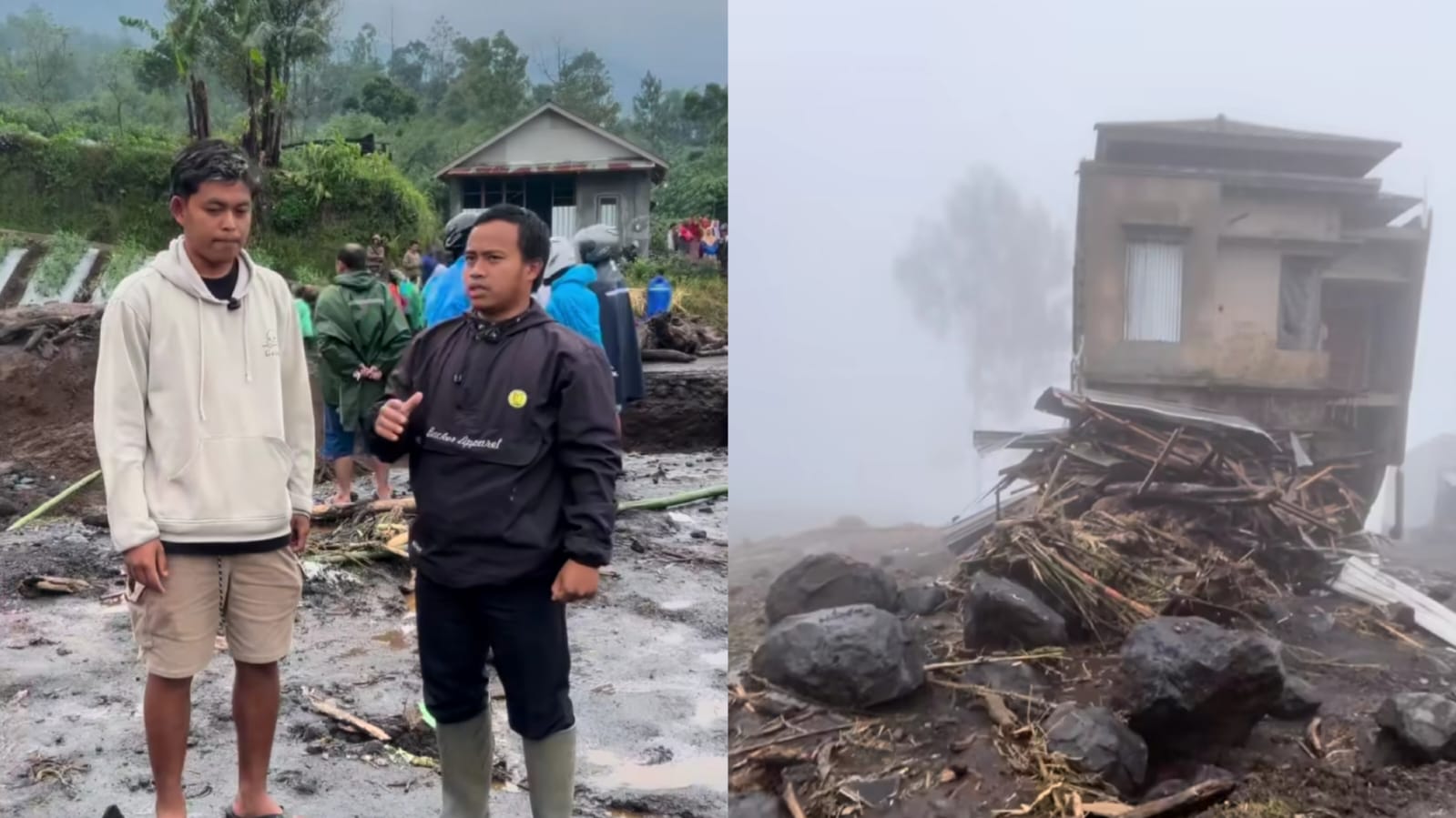 Bongkahan batu beragam ukuran juga terlihat berserakan, memenuhi area jalan dan menghantam rumah warga.