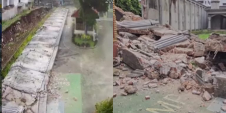 Dalam video yang beredar, terlihat puing-puing tembok yang berasal dari sebuah rumah mewah yang berserakan di area sekolah.