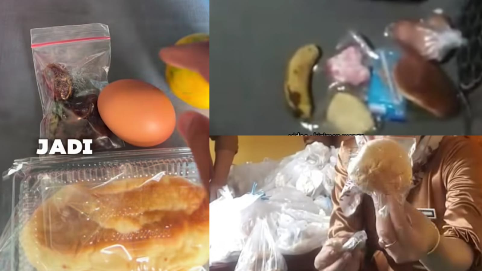 Video tersebut kemudian beralih pada seorang siswa yang mulai mengeluarkan satu per satu makan MBG yang didapatnya.