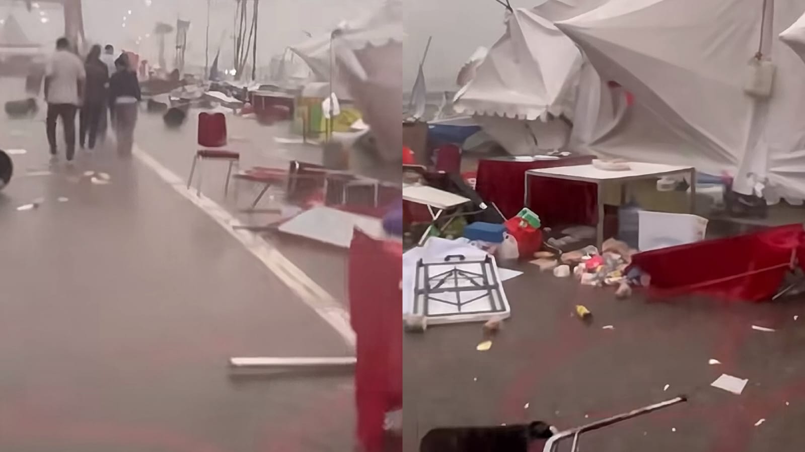 Dalam video yang beredar, tampak kondisi deretan tenda porak poranda dan kepanikan pengusaha UMKM untuk menyelamatkan barang jualannya.